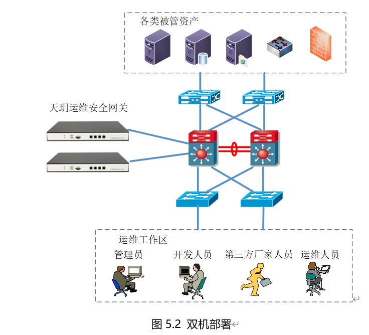 如图所示,天玥OSM系统旁路方式部署于网络中,无需对网络结构进行任何调整。部署天玥OSM系统后,运维人员直接访问天玥OSM系统的对应端口,建立安全加密的数据通道,然后再通过天玥OSM系统发起到服务器对应服务的访问,运维人员无需直接访问服务器,从而进一步加强内部服务器的安全性。