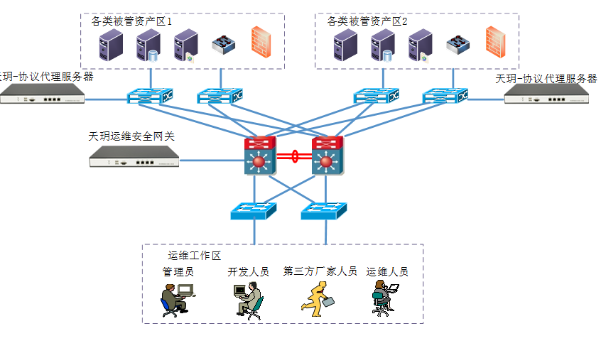 如图所示,天玥OSM系统支持分布式部署,把天玥OSM系统切换至协议代理服务器模式部署在各个合适的网络节点,天玥OSM系统主服务器部署在上层中心交换网络中。通过天玥OSM系统主服务器管理界面对所有协议代理服务器进行统一的管理,运维用户运维操作产生的协议代理行为会通过负载均衡的方式分配到协议代理服务器上,同时各协议代理服务器实时传输审计日志到天玥OSM系统主服务器。