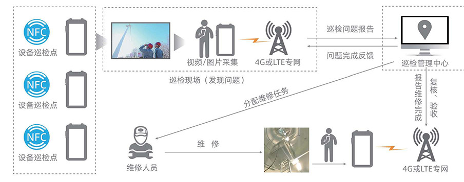 智能巡检系统是集NFC识别技术与数控管理应用融为一体的综合性管理系统,利用NFC技术以及移动终端对设备工作状态进行巡检,既能存储大量的运行数据,还具有记录设备的缺陷情况,在线报修,执行维修等功能。NFC技术在设备智能巡检方案中的应用有着非常重要的意义:NFC技术即可对设备信息进行识别,加强了运行巡检工作的过程控制与监督,提高巡检效率及准确性,解决繁杂的基础数据录入及传统巡检中的疑难问题等,又能减小巡检工作人员的工作难度,实现了视频回传/VR指导、巡检的信息化,自动化和规范化管理。